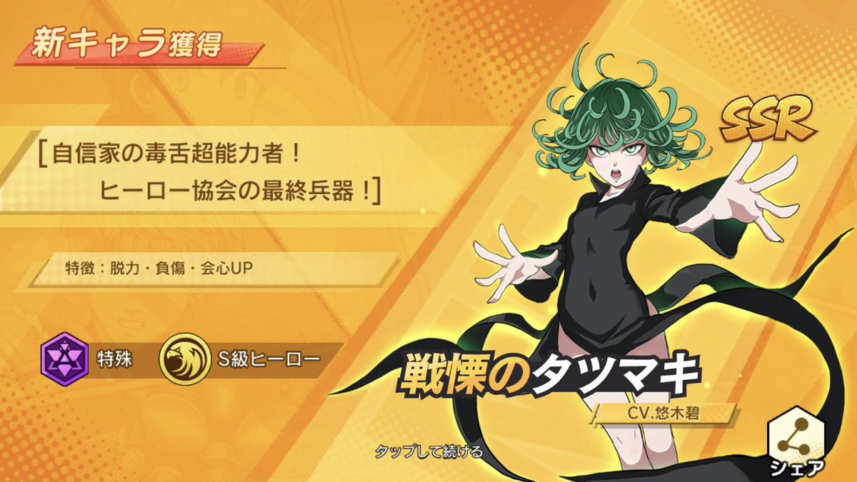 ガールズコントラクト最強当たりキャラ ガールズコントラクトの リセマラ最強キャラは幻神仲間 と呼ばれるキャラクターたちです。 幻神仲間はガチャからは s 級の状態で排出されますが、 育成するとssr級まで覚醒 させることができます。 tvアニメ「ワンパンマン」が待望のスマホゲーム化!新作rpgを先行プレイ!pr 『one punch man 一撃マジファイト』は、 大人気tvアニメ『one punch man(以下、ワンパンマン)』 をベースとしたrpg。 すでに中国をはじめとする海外各地で配信され注目を浴びている本作が、 年10月29日 についに日本 one punch man 一撃マジファイト(ワンパンマン マジファイ)における、ヒーロークラスのキャラクターを一覧でまとめてます。ヒーロータイプの確認をしたい方は、ぜひご覧ください。